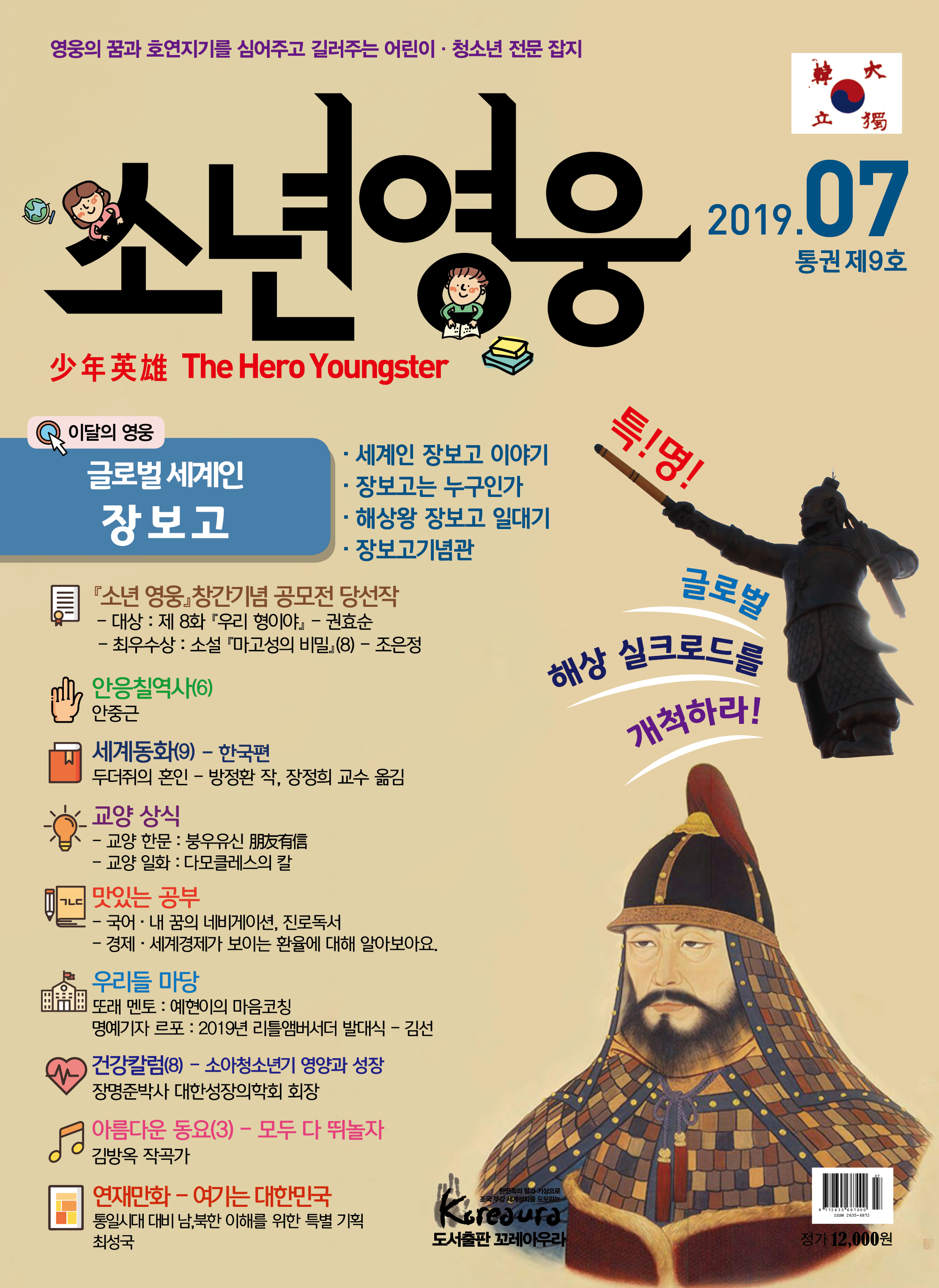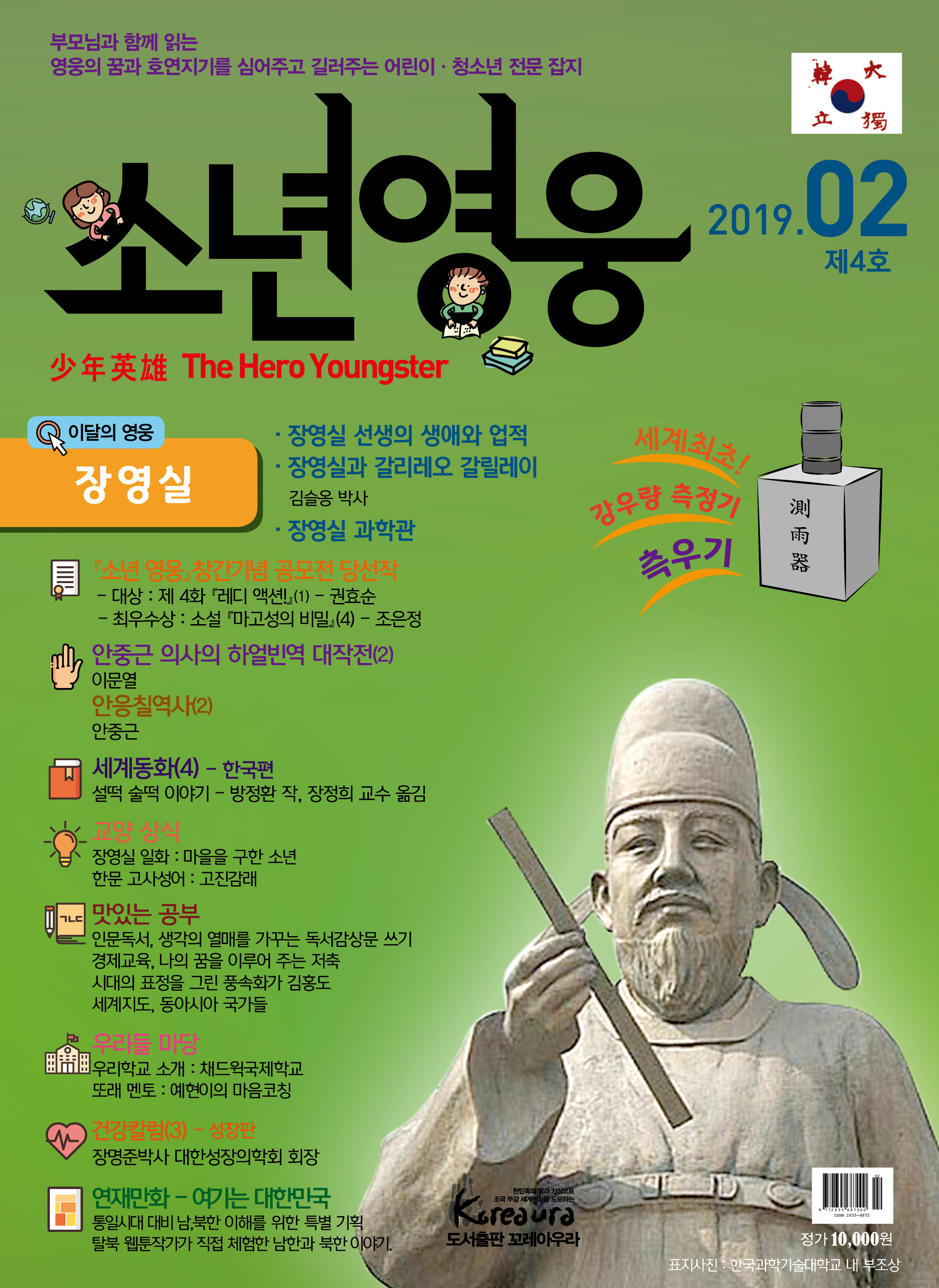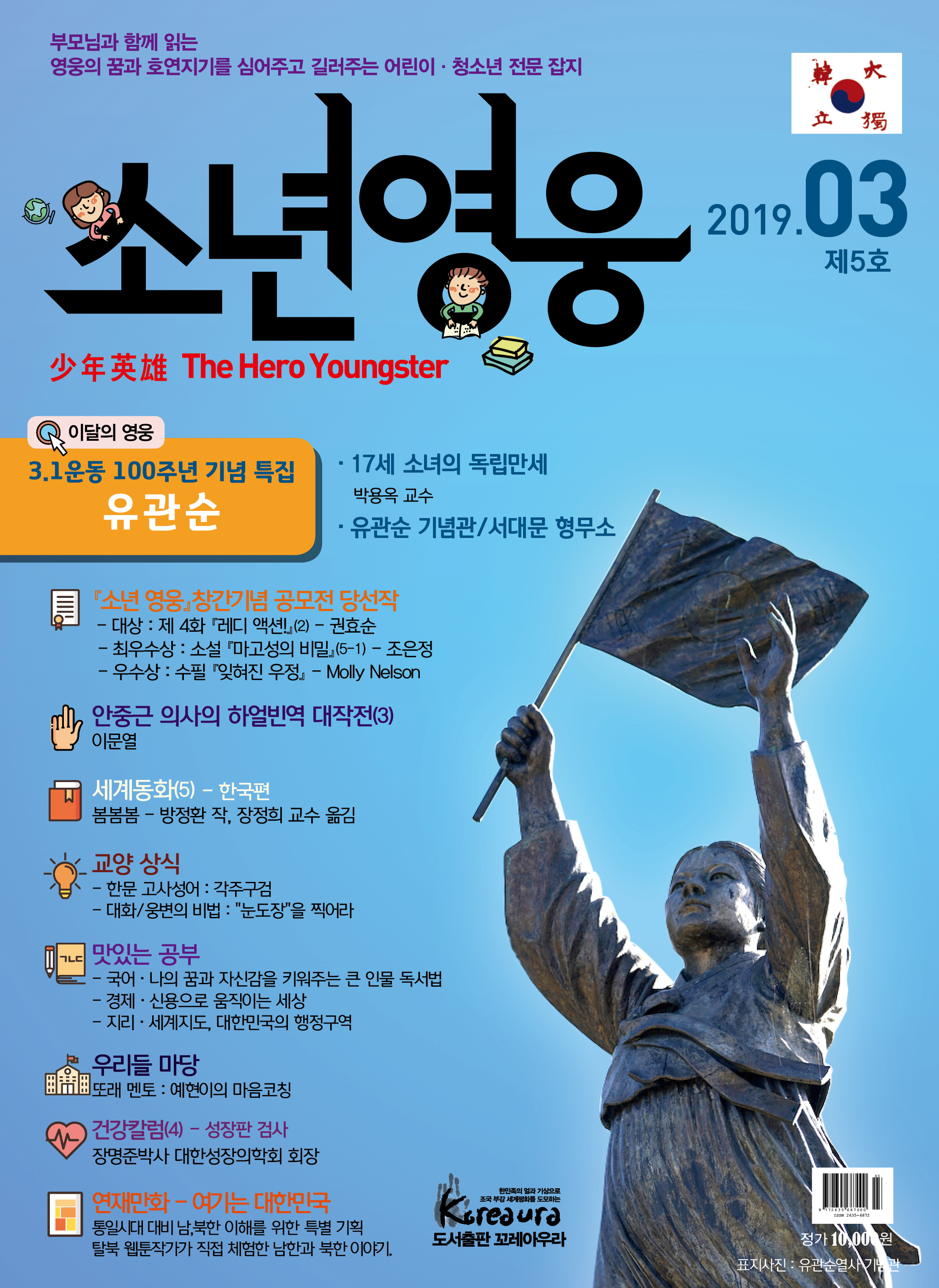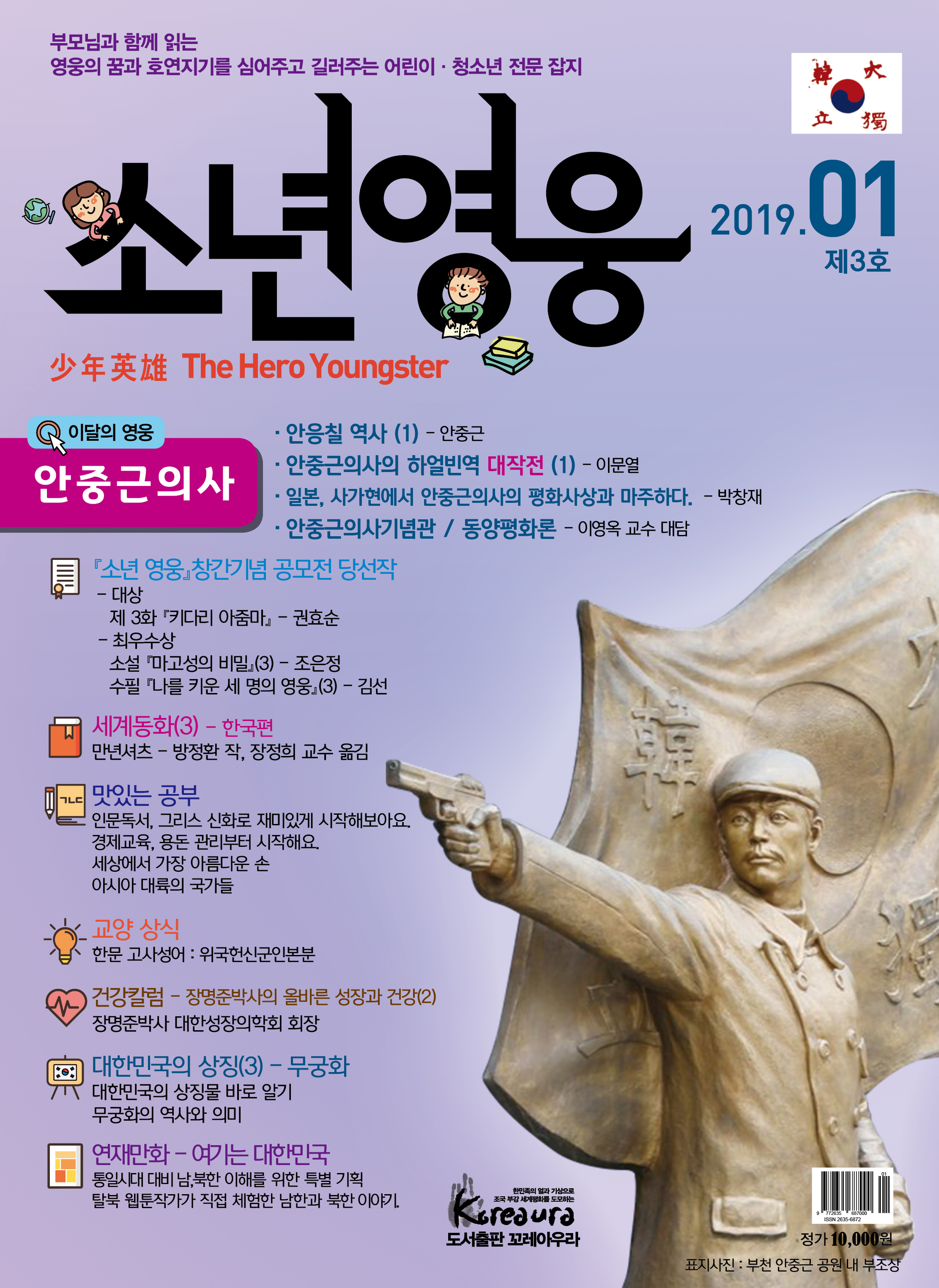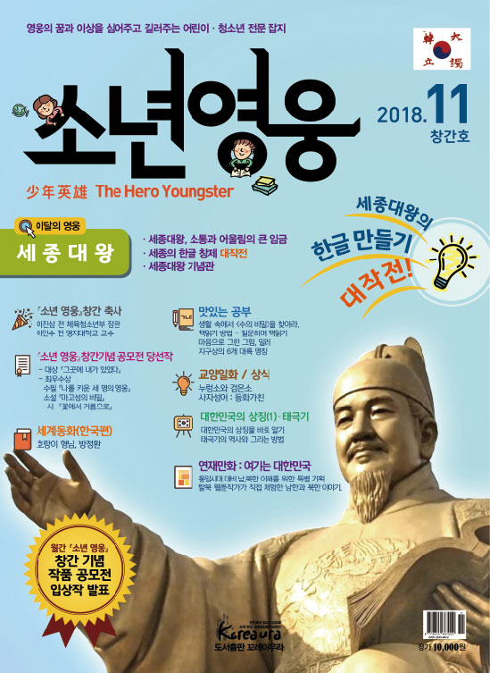 도서출판 꼬레아우라는 월간 『영웅』 창간 3주년 을 맞아 대한민국의 100년, 1000년 대계를 위 해, 내일의 대한민국 주인공인 어린이·청소년 의 가슴에 미래에 대한 무한한 꿈과 포부, 호연 지기를 품게 하고, 인성이 형성되는 어릴적부터 나라 사랑하는 마음, 올바른 역사관, 세계관을 심어 주기 위한 어린이·청소년 전문 잡지 월간 『소년 영웅』을 창간합니다. |