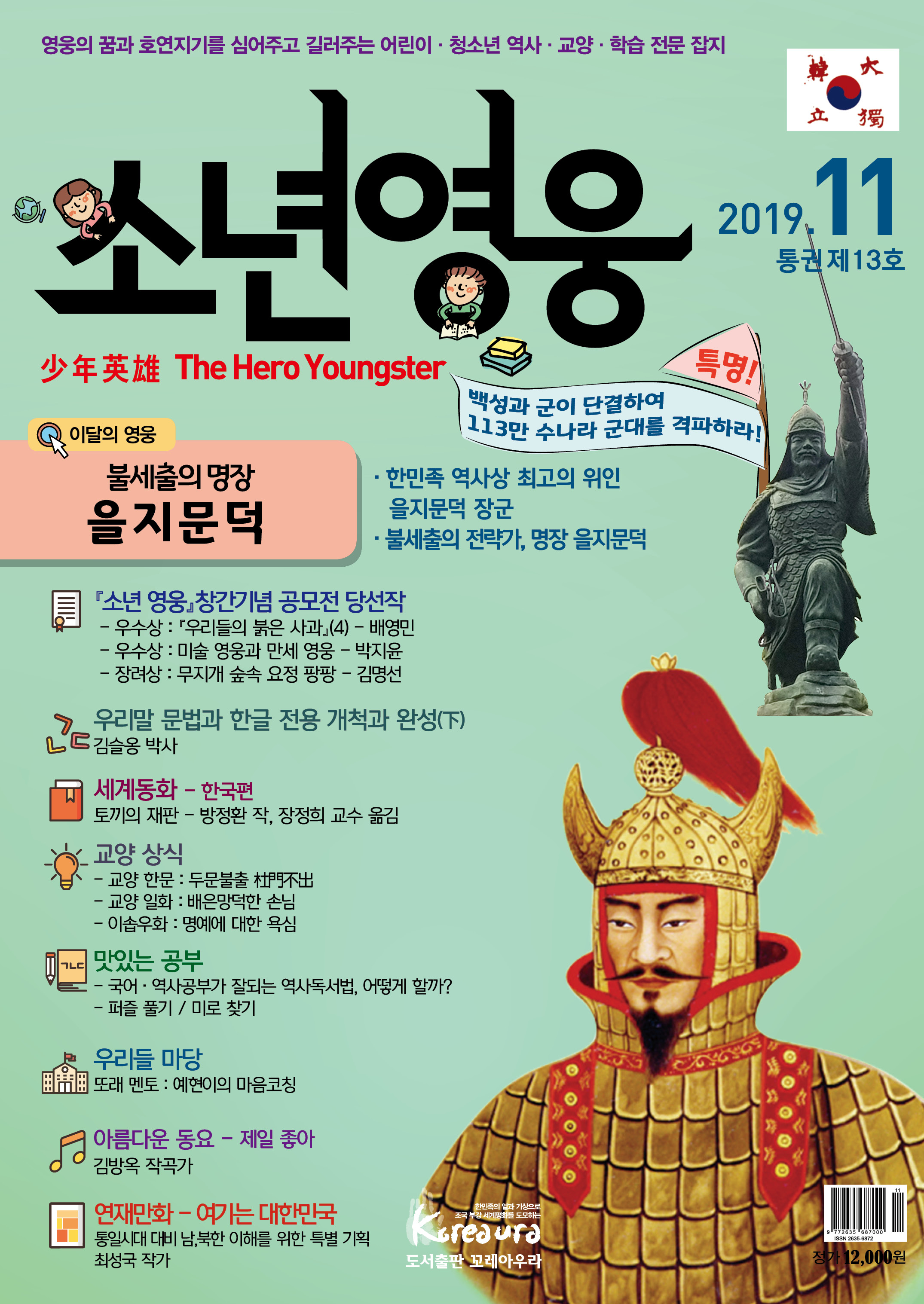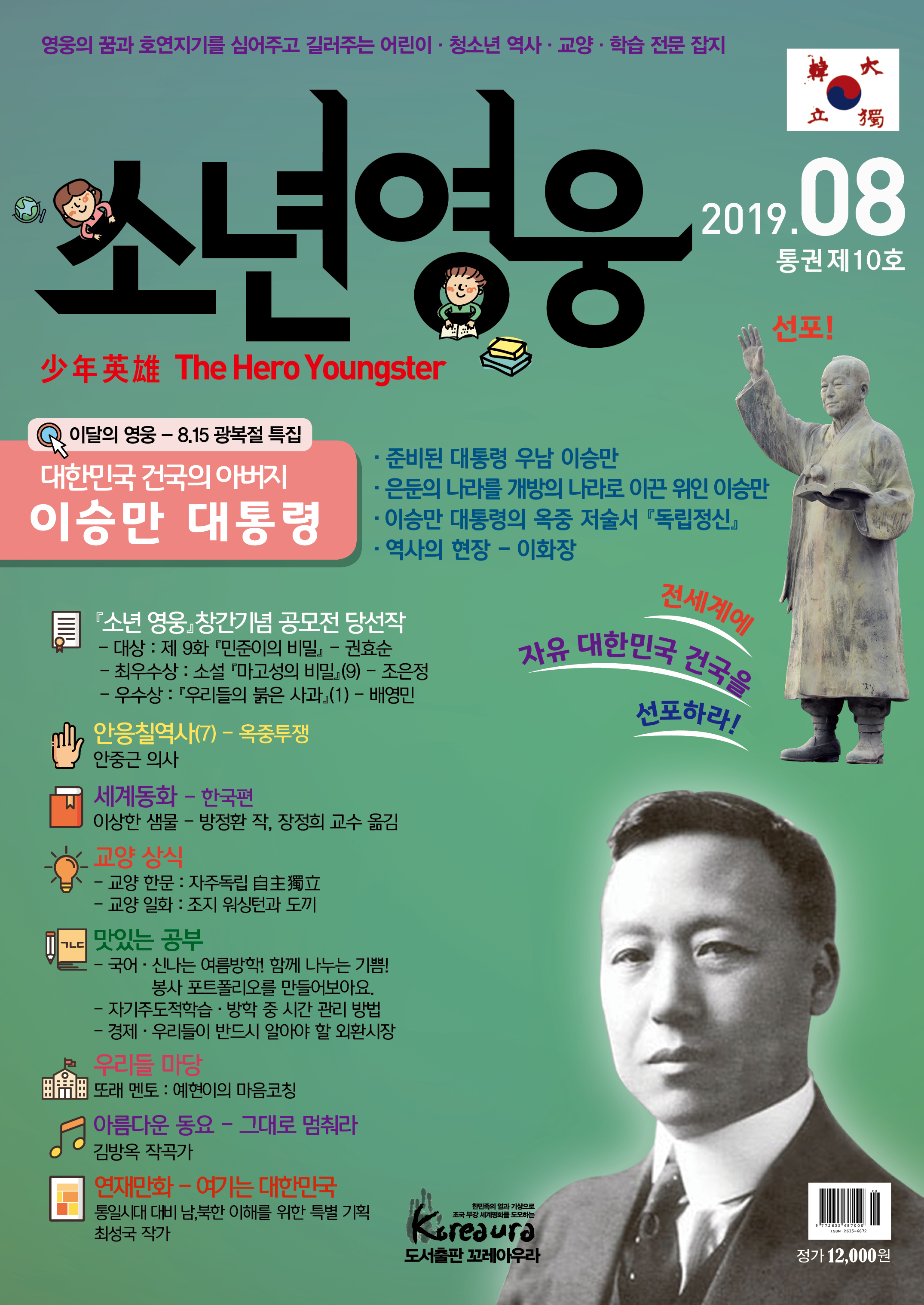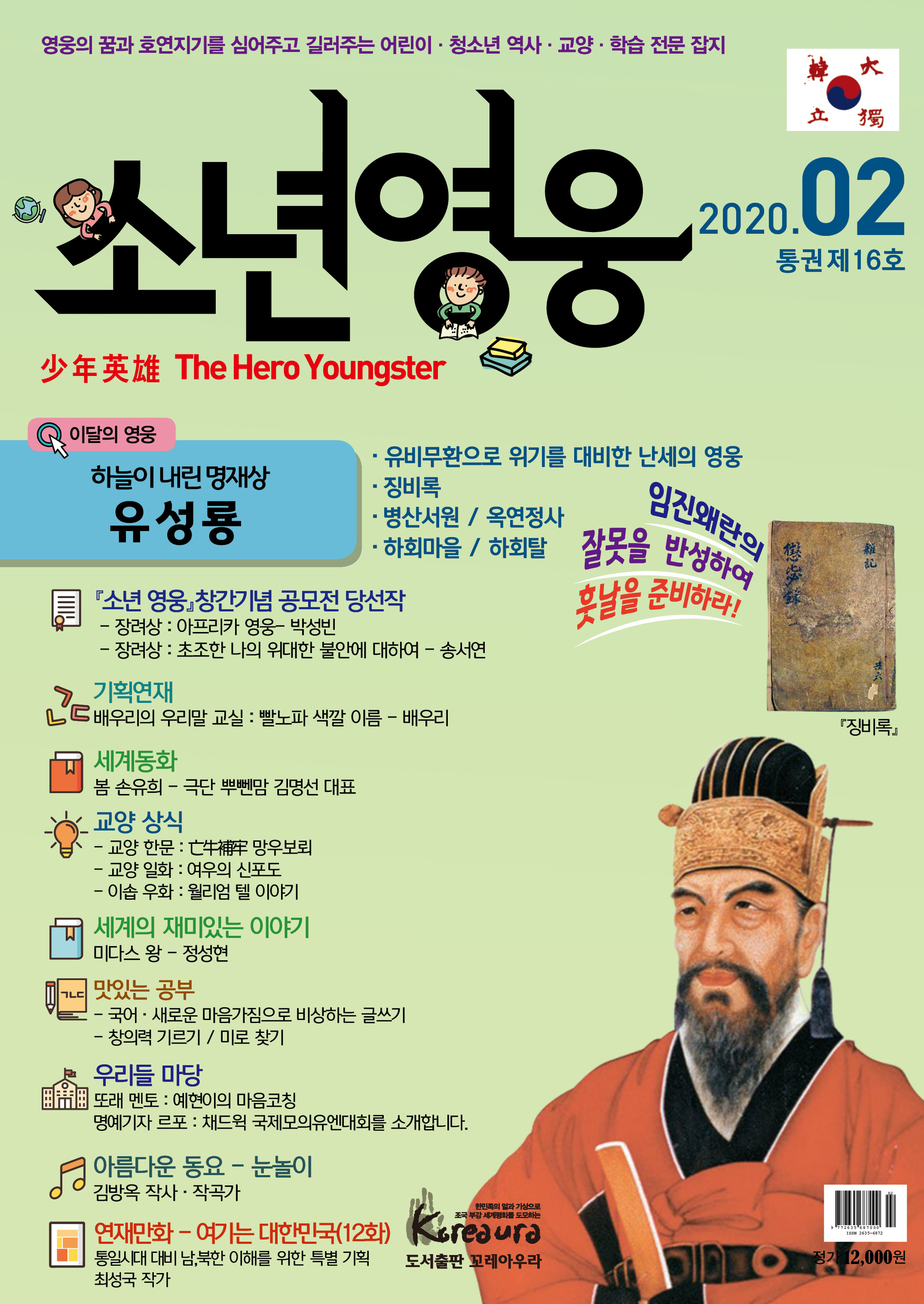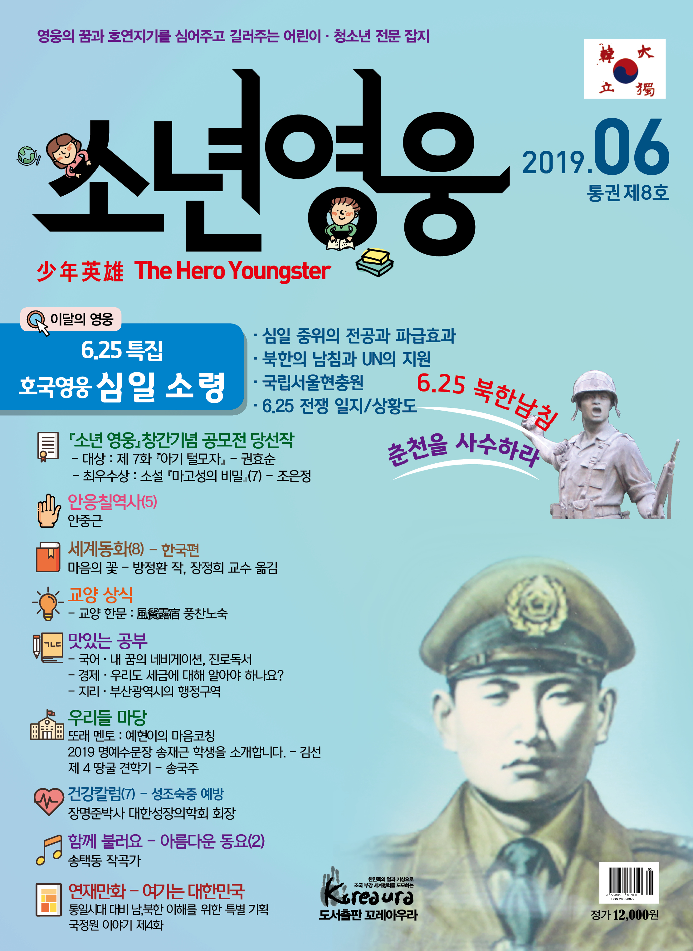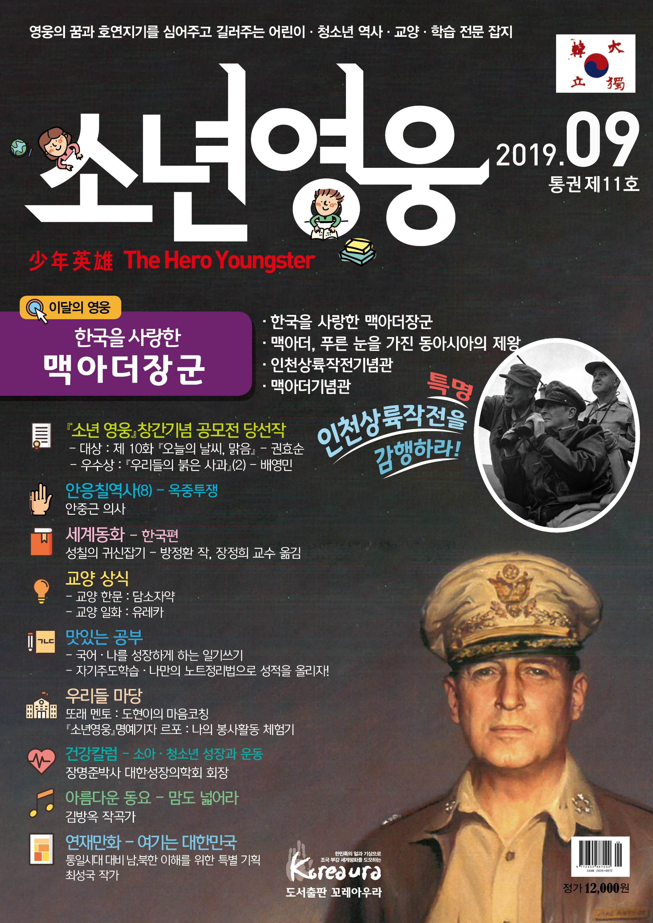 도서출판 꼬레아우라는 월간 『영웅』 창간 3주년 을 맞아 대한민국의 100년, 1000년 대계를 위 해, 내일의 대한민국 주인공인 어린이·청소년 의 가슴에 미래에 대한 무한한 꿈과 포부, 호연 지기를 품게 하고, 인성이 형성되는 어릴적부터 나라 사랑하는 마음, 올바른 역사관, 세계관을 심어 주기 위한 어린이·청소년 전문 잡지 월간 『소년 영웅』을 창간합니다. |